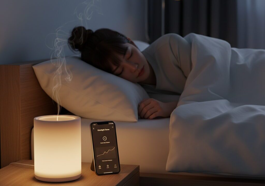 ベッドサイドで、スマートフォンアプリでタイマー設定されたSwitchBotキャンドルウォーマーの穏やかな香りに包まれ、ぐっすり眠る日本人女性。パーシーのガジェブロイメージ