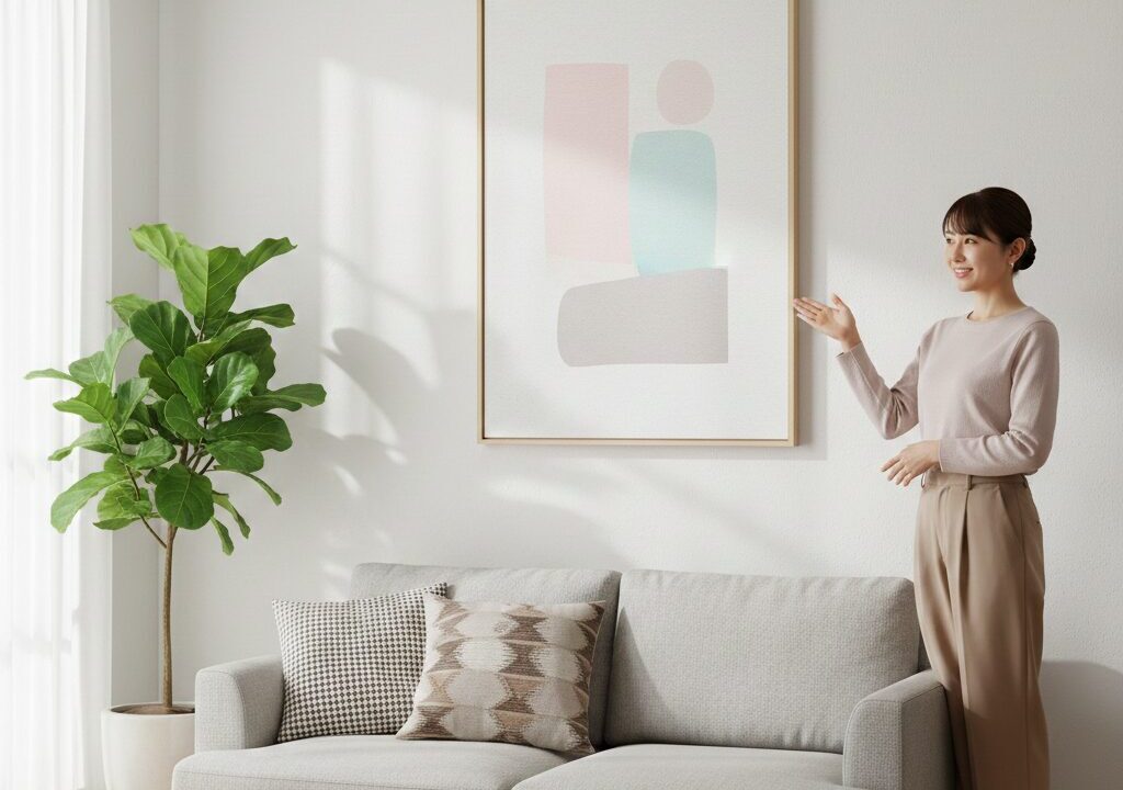 - 照明計画を考える: 前述の通り、自発光しないため暗闇では見えなくなります。夜間もアートを楽しみたい場合は、天井のダウンライトの位置に合わせて設置するか、充電式のスポットライトを併用して絵に光を当てるなどの工夫が必要です。この「照明を当てる」行為そのものが、美術館のような雰囲気を醸し出します。