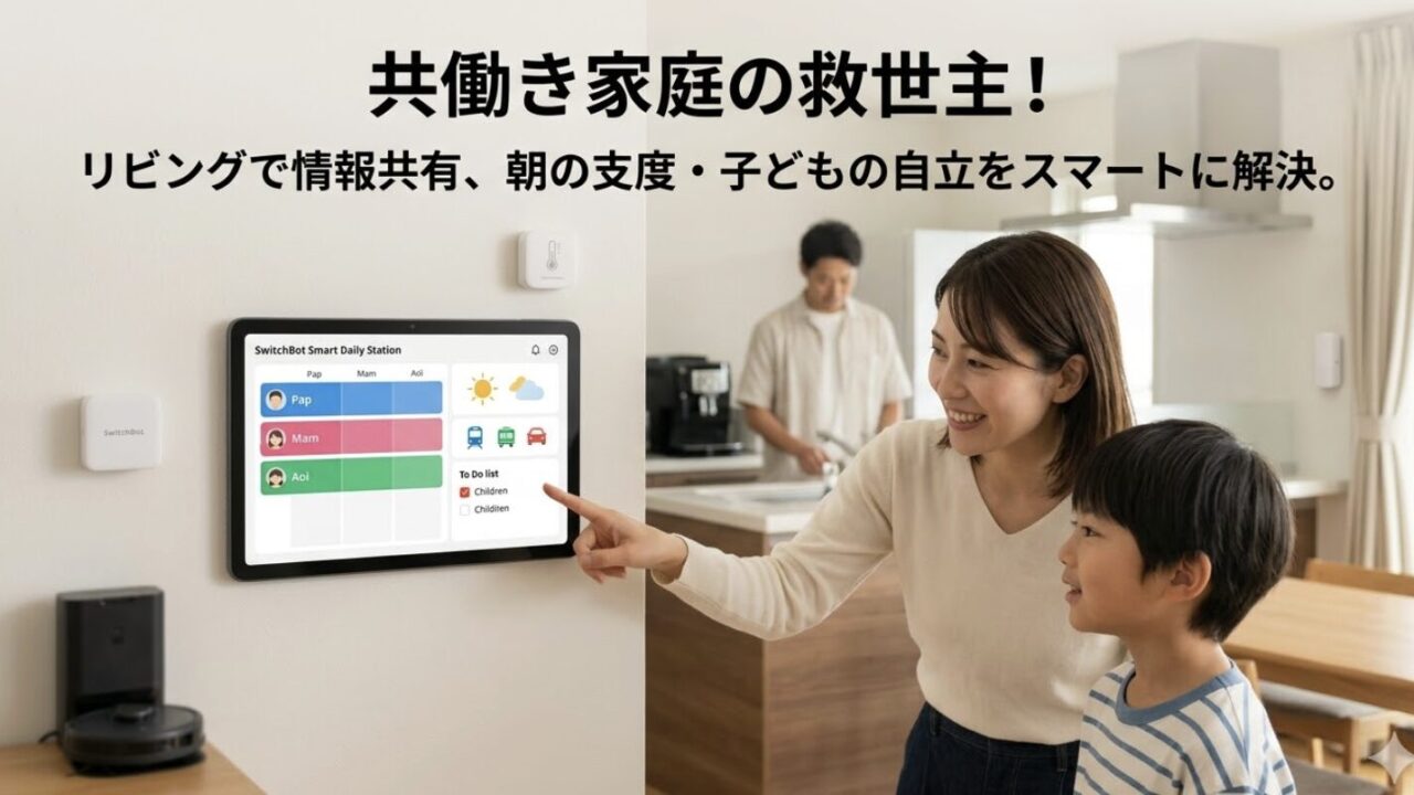 共働き家庭の救世主となる「SwitchBot スマートデイリーステーション」は、毎朝平均20分短縮されるルーティンと、週に3回以上発生していた家族間の情報共有ミスを解消します。リビングに設置することで、夫婦間の情報格差はゼロとなり、お子様の「自分でできた」を促すリマインド機能で、親御さんの声がけ負担を1日あたり15分削減します。