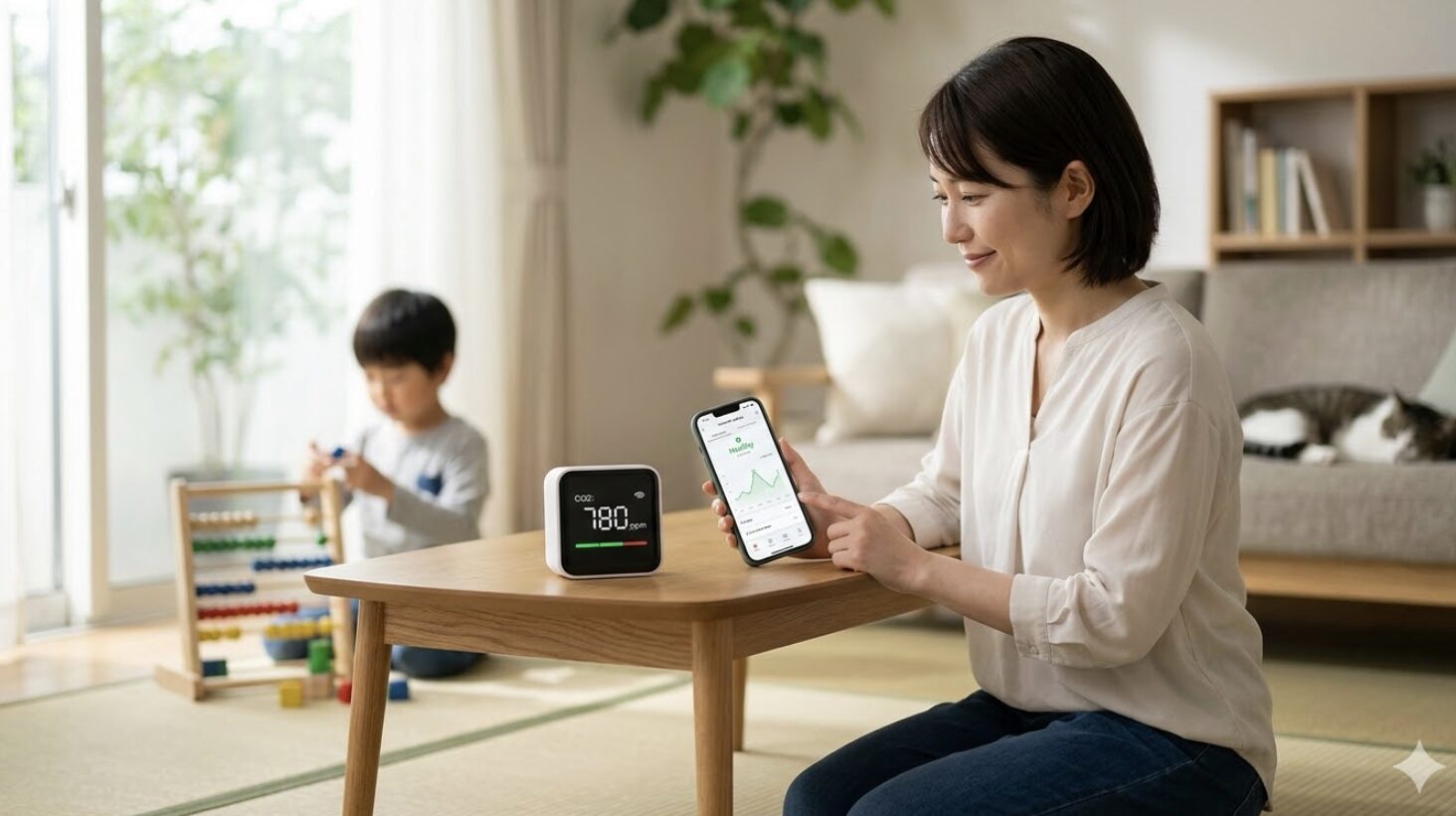 さらに、CO2センサーがもたらすのは、目に見えない「安心」です。リビングや書斎の空気の質を常に把握し、家族の健康を守るための最適な換気タイミングを教えてくれます。もはや感覚に頼る必要はありません。CO2濃度が高まれば、SwitchBotエコシステムと連携して自動で換気を行い、常にクリーンな環境を維持することも可能です。これにより、在宅勤務中の集中力向上や、お子様の学習環境の改善にも繋がり、家族みんなが健やかに過ごせる空間が実現します。