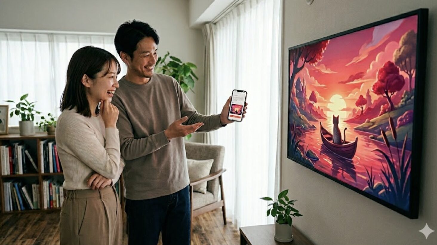 来客時には、AIが事前に設定されたゲストの好みに合わせて、会話のきっかけとなるようなアートを提案し、さりげなく空間を演出することも可能です。季節のイベントごとにも、ワンタップでクリスマスツリーやハロウィンのテーマアートに切り替えられ、手軽に部屋の表情を変えられます。